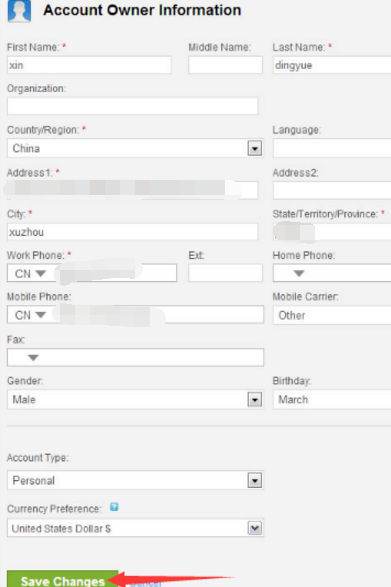 按照上述表格中,红色*星号是必须填写的,其他选项可以不填写,对于地址和国家建议稍微真实一些,可以胡编乱造但也不要跨界。这样可以有效的确保账户的信息完整。在SAVE CHANGES保存之后我们的账户就注册完毕。